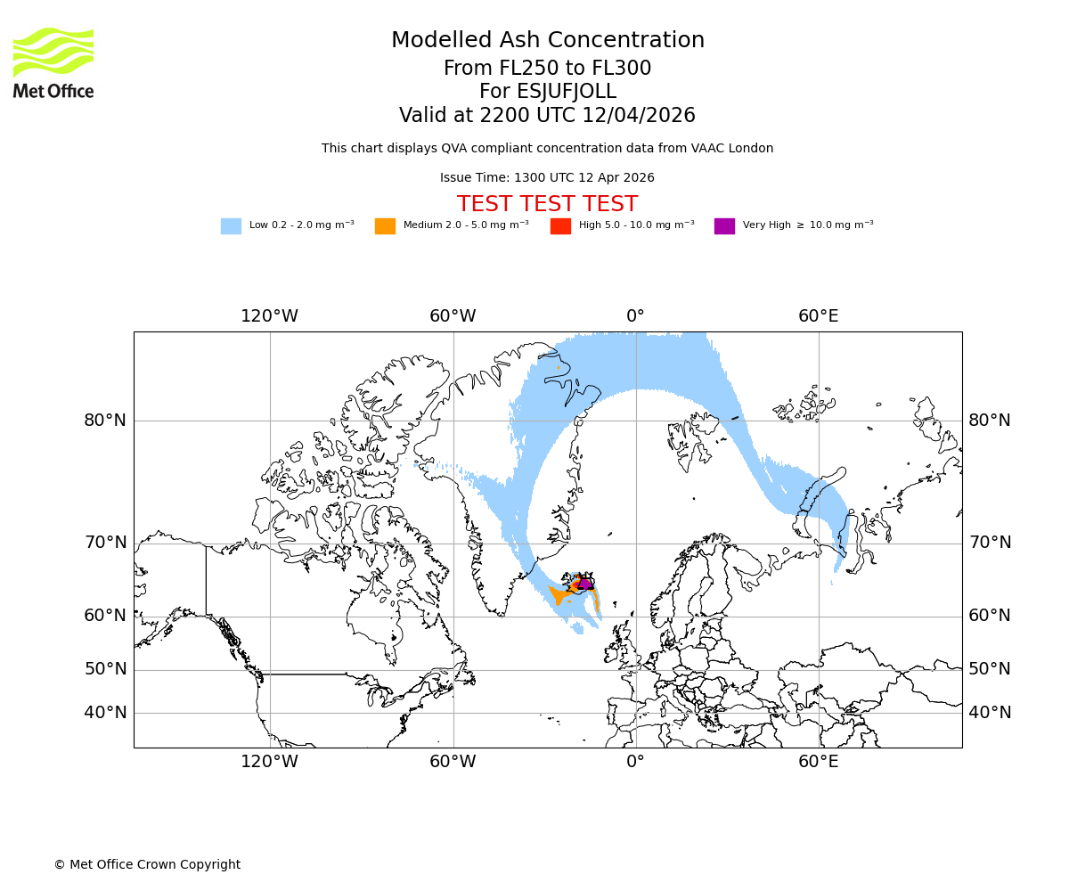 Modelled ash concentration from 250 to 300 for ESJUFJOLL. Valid at 1900 UTC 12/04/2026