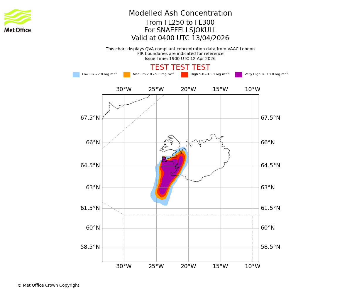 Modelled ash concentration from 250 to 300 for SNAEFELLSJOKULL. Valid at 0100 UTC 13/04/2026