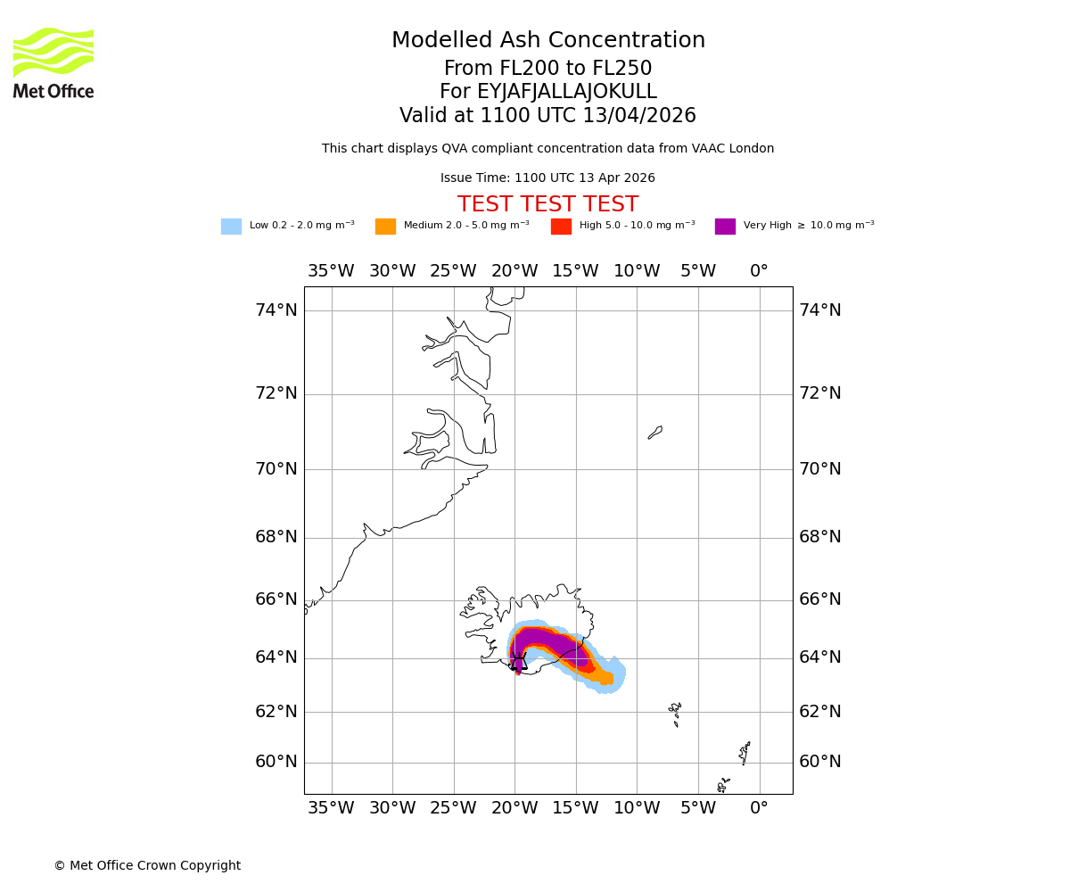 Modelled ash concentration from 000 to 200 for EYJAFJALLAJOKULL. Valid at 1100 UTC 13/04/2026