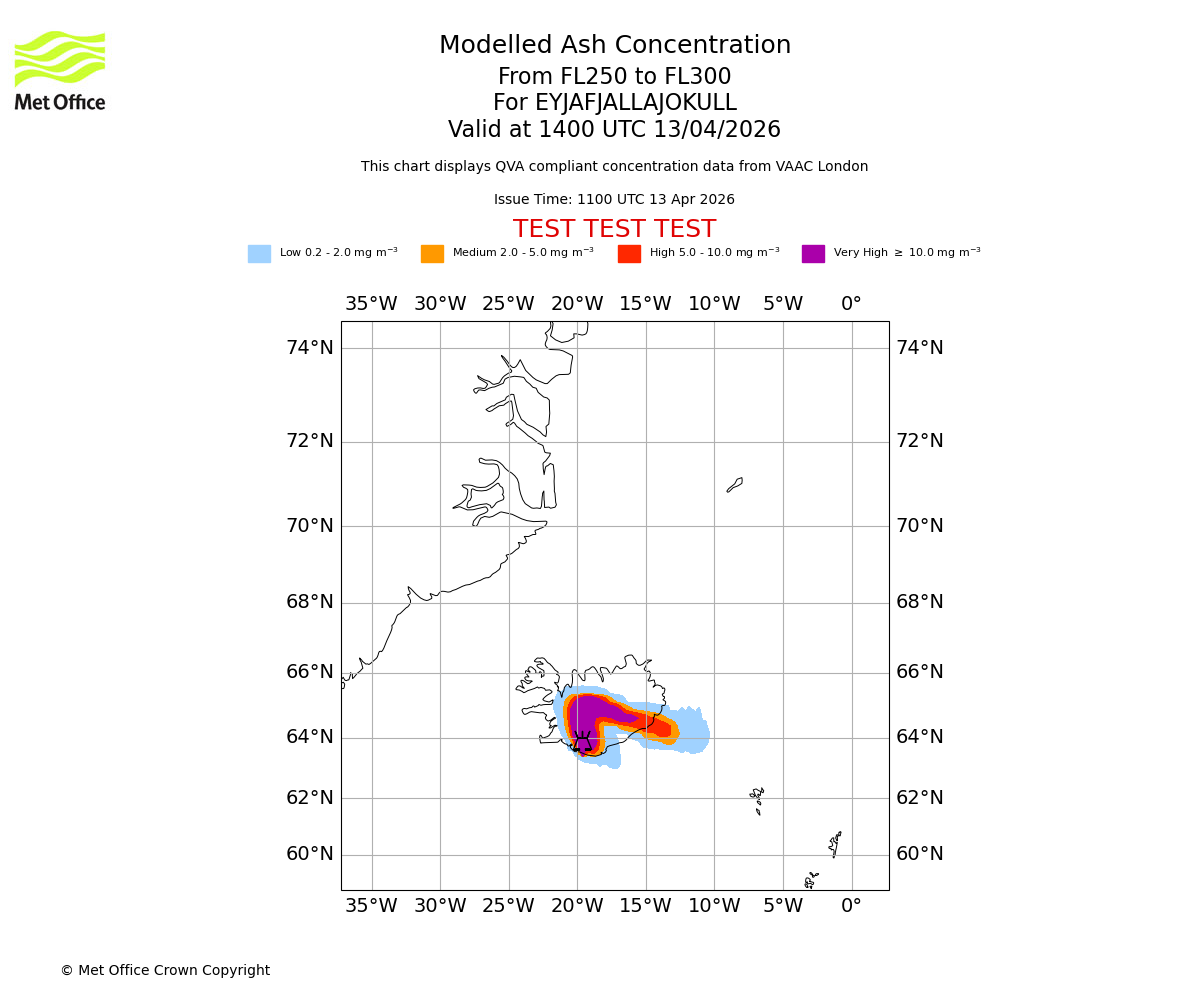 Modelled ash concentration from 250 to 300 for EYJAFJALLAJOKULL. Valid at 1100 UTC 13/04/2026