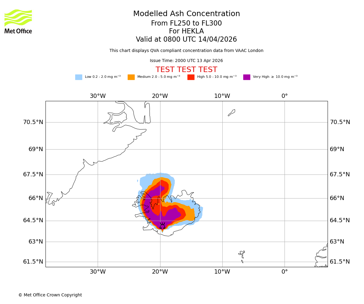 Modelled ash concentration from 250 to 300 for HEKLA. Valid at 0500 UTC 14/04/2026