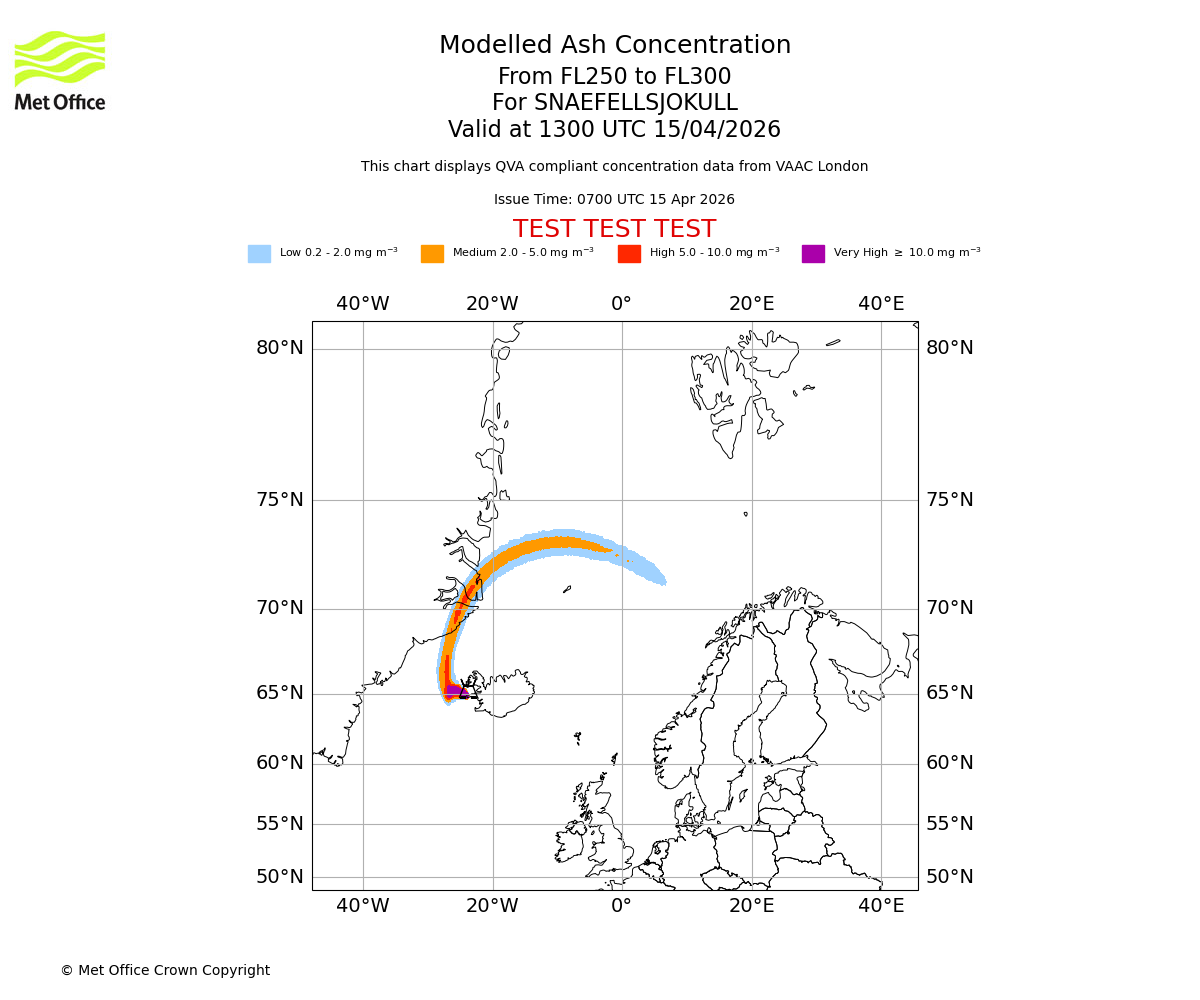 Modelled ash concentration from 250 to 300 for SNAEFELLSJOKULL. Valid at 1000 UTC 15/04/2026