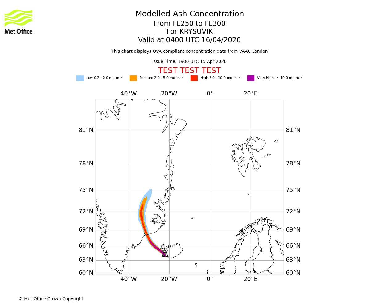 Modelled ash concentration from 250 to 300 for KRYSUVIK. Valid at 0100 UTC 16/04/2026