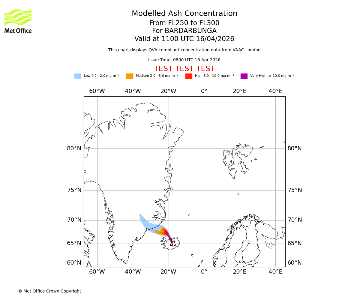 Modelled ash concentration from 250 to 300 for BARDARBUNGA. Valid at 0800 UTC 16/04/2026