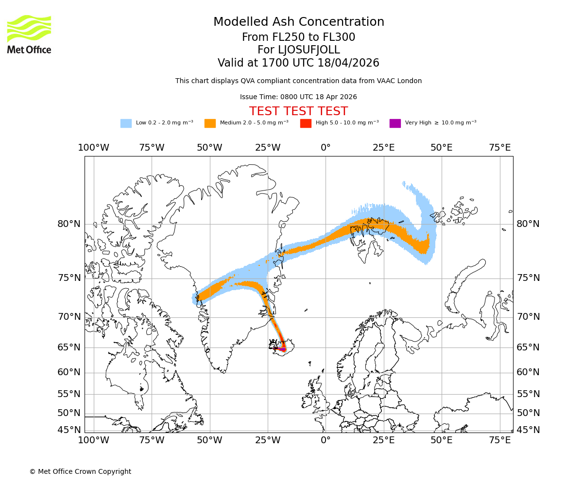 Modelled ash concentration from 250 to 300 for LJOSUFJOLL. Valid at 1400 UTC 18/04/2026
