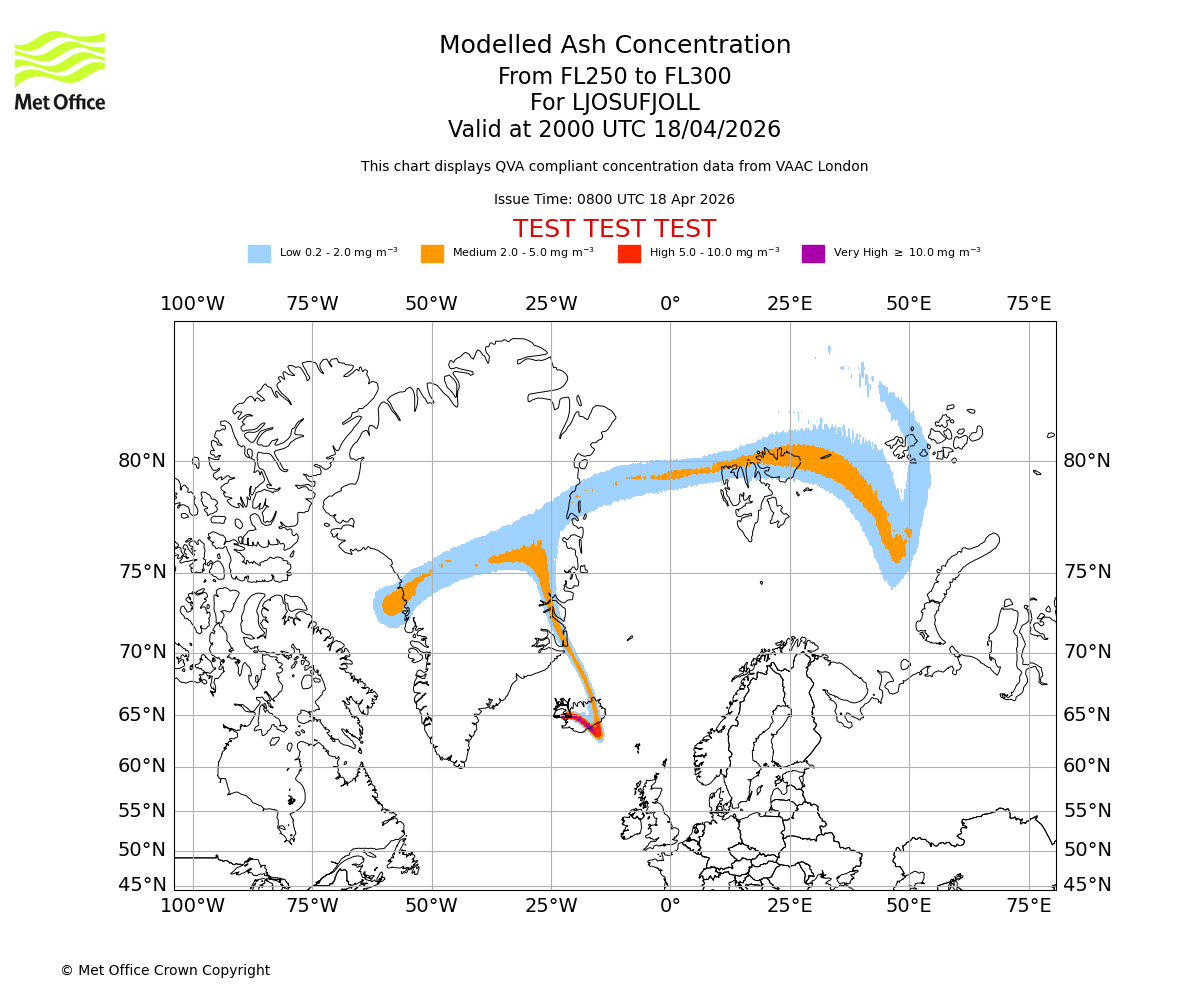 Modelled ash concentration from 000 to 200 for LJOSUFJOLL. Valid at 0800 UTC 18/04/2026