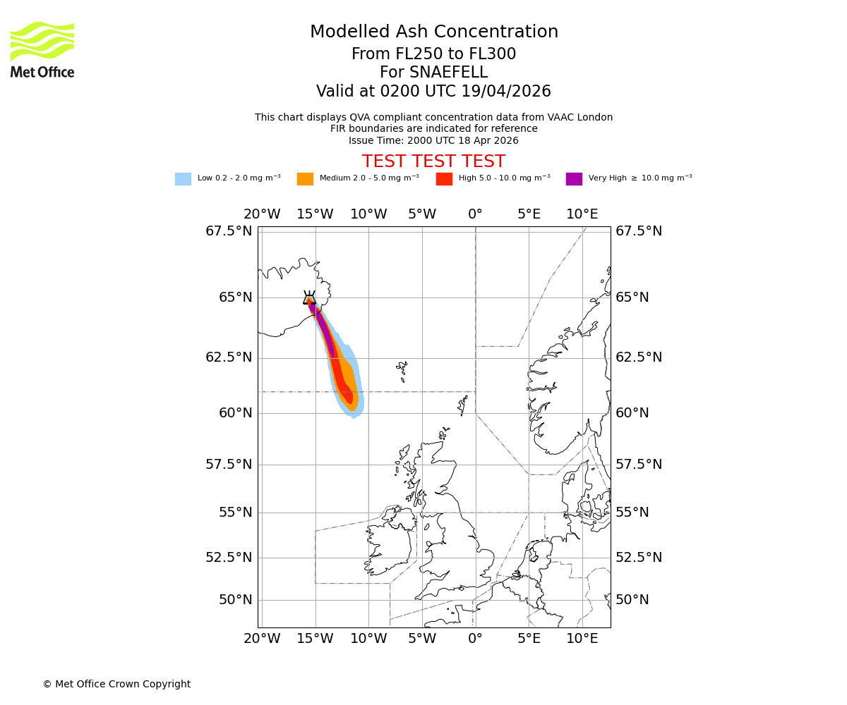 Modelled ash concentration from 250 to 300 for SNAEFELL. Valid at 2300 UTC 18/04/2026