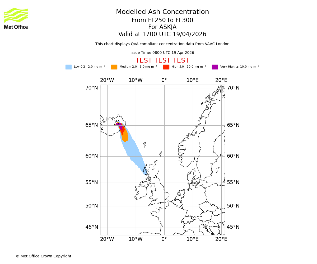 Modelled ash concentration from 250 to 300 for ASKJA. Valid at 1400 UTC 19/04/2026