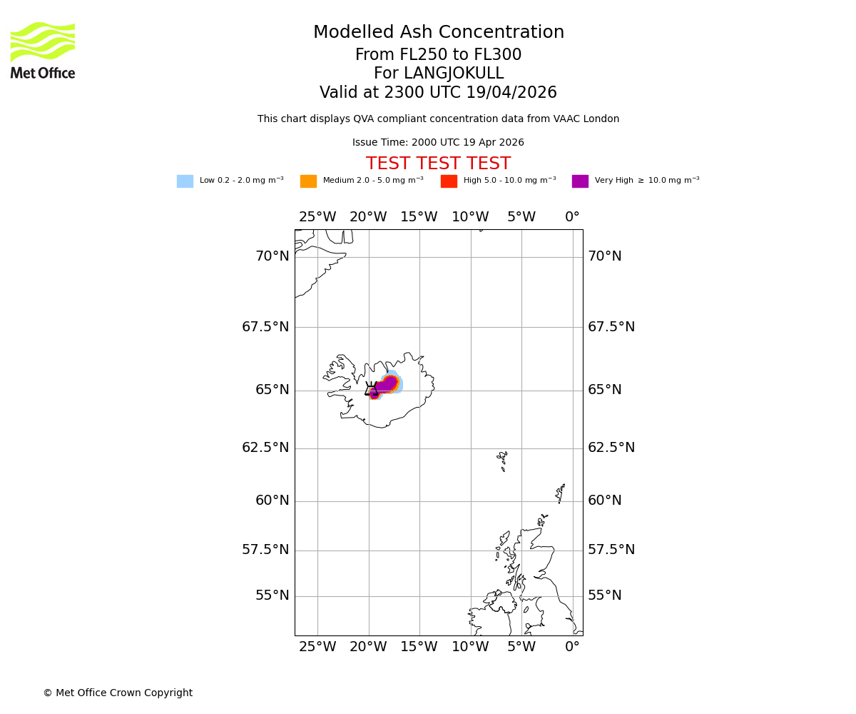 Modelled ash concentration from 250 to 300 for LANGJOKULL. Valid at 2000 UTC 19/04/2026