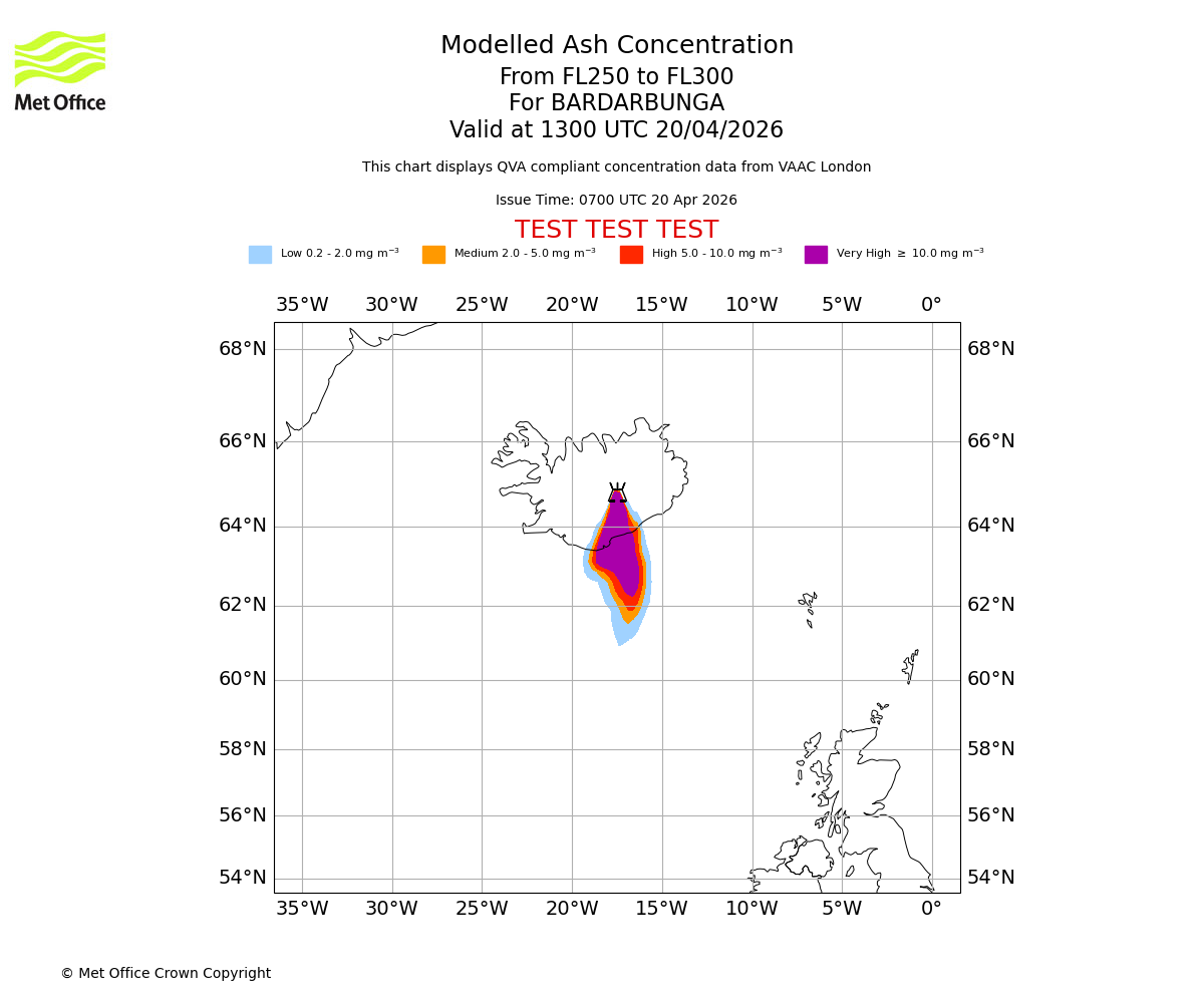 Modelled ash concentration from 250 to 300 for BARDARBUNGA. Valid at 1000 UTC 20/04/2026