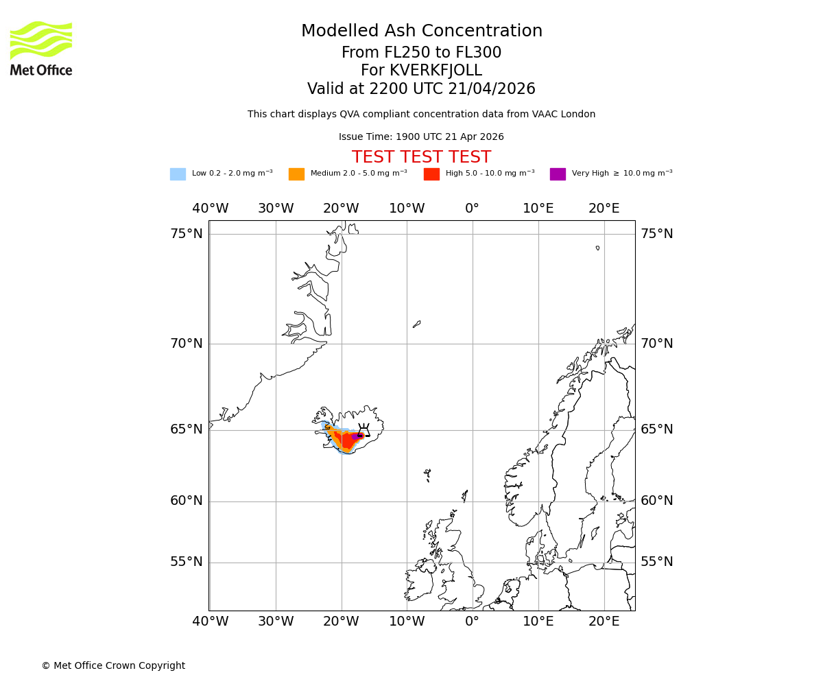Modelled ash concentration from 250 to 300 for KVERKFJOLL. Valid at 1900 UTC 21/04/2026