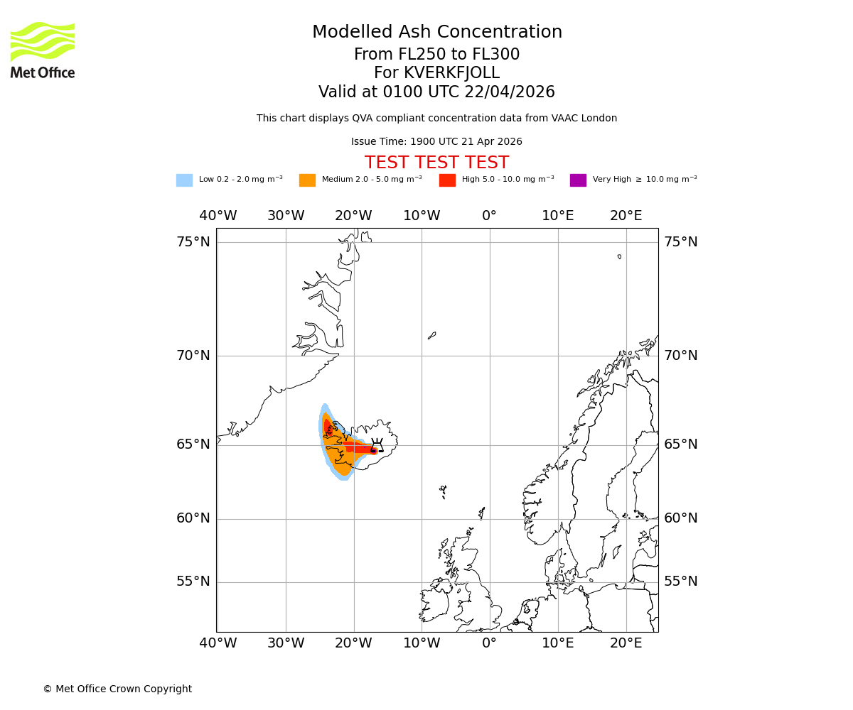 Modelled ash concentration from 250 to 300 for KVERKFJOLL. Valid at 2200 UTC 21/04/2026