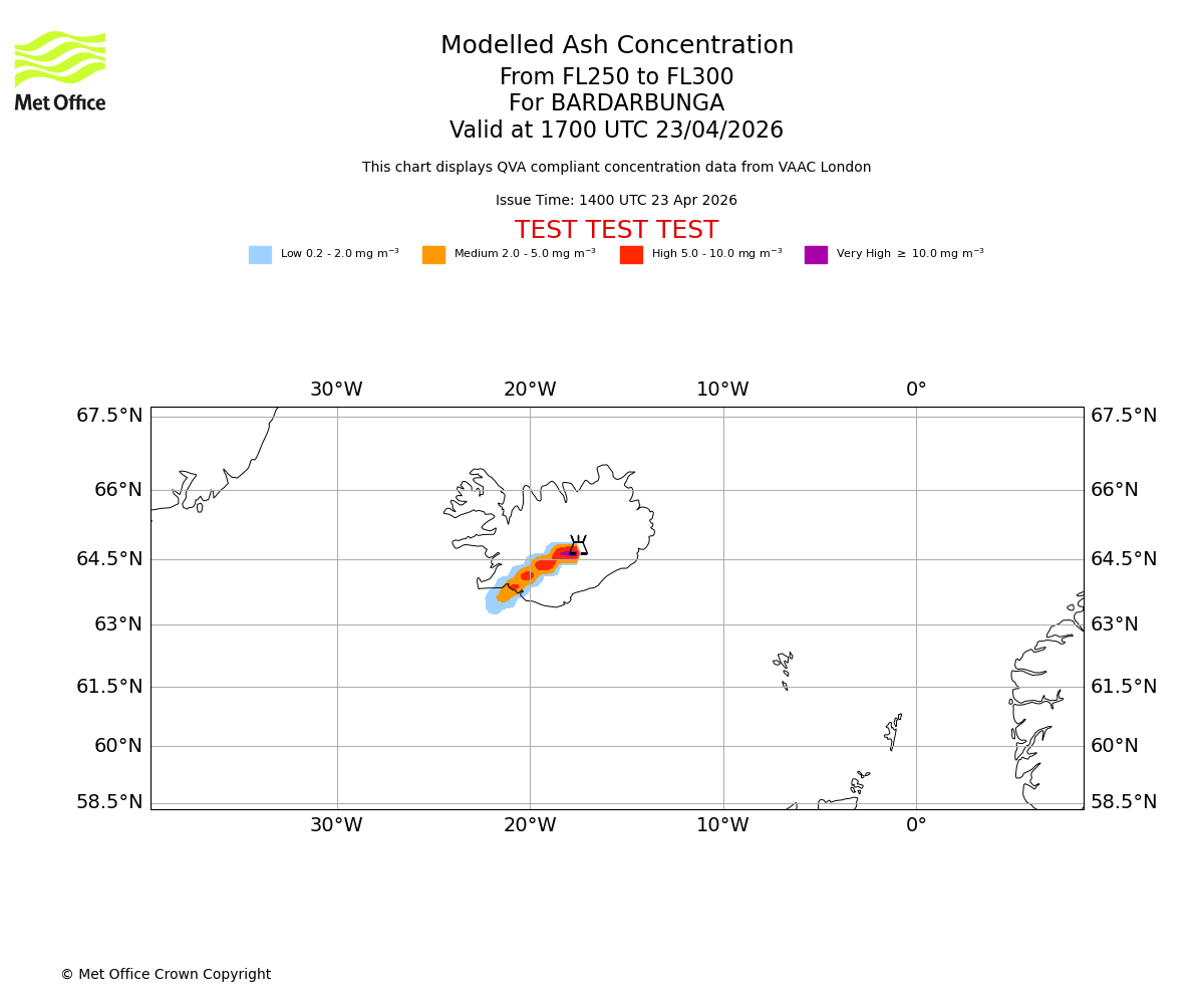 Modelled ash concentration from 250 to 300 for BARDARBUNGA. Valid at 1400 UTC 23/04/2026