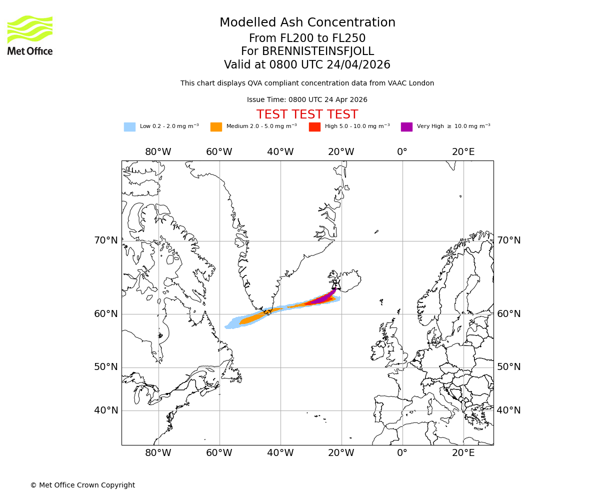 Modelled ash concentration from 000 to 200 for BRENNISTEINSFJOLL. Valid at 0800 UTC 24/04/2026