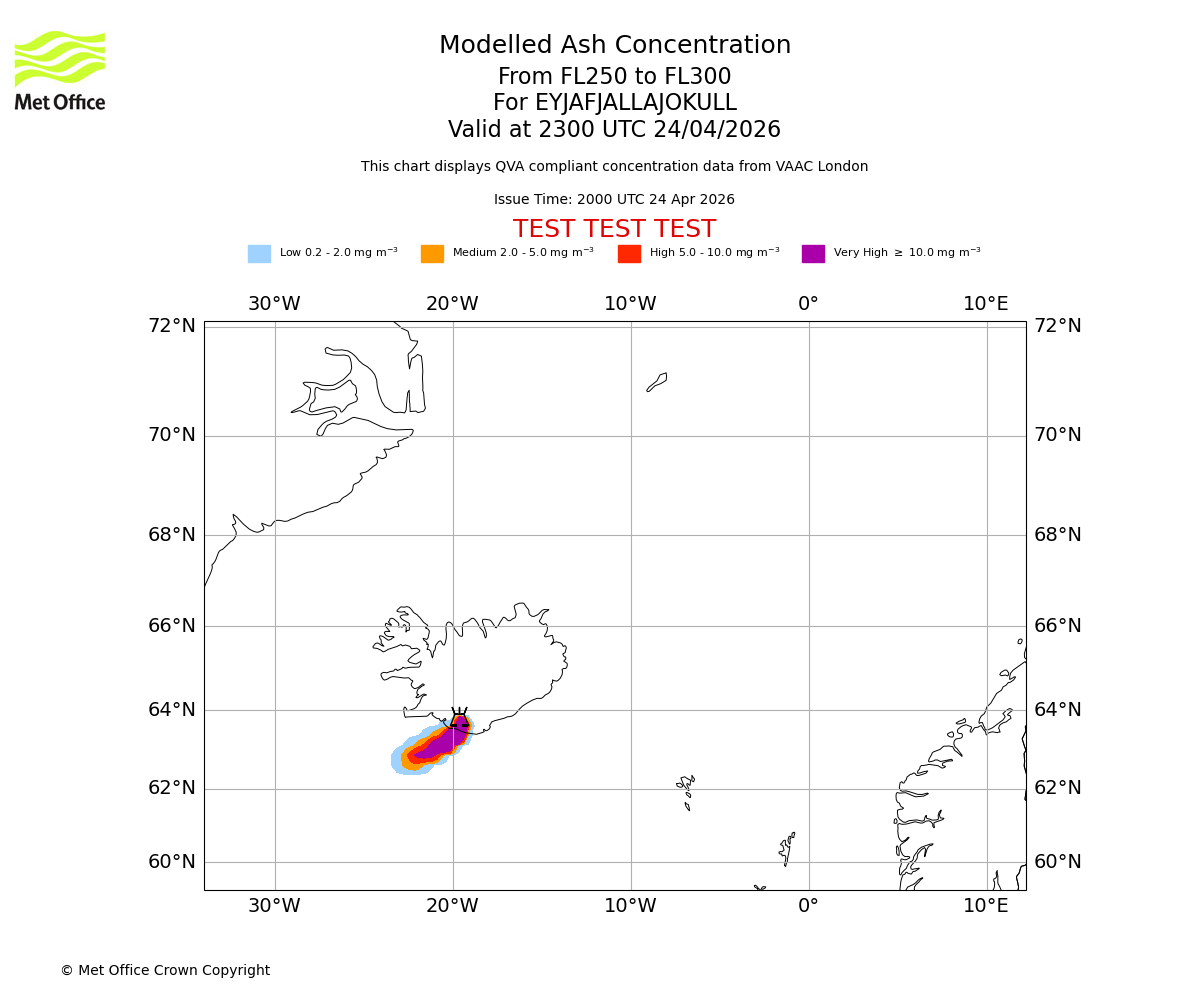 Modelled ash concentration from 250 to 300 for EYJAFJALLAJOKULL. Valid at 2000 UTC 24/04/2026