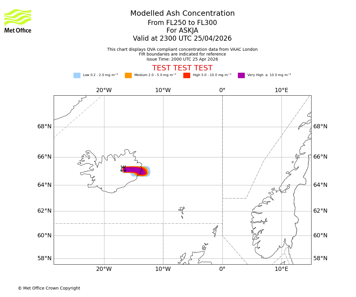 Modelled ash concentration from 250 to 300 for ASKJA. Valid at 2000 UTC 25/04/2026