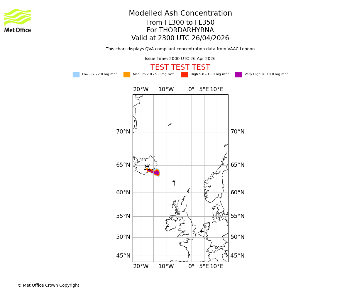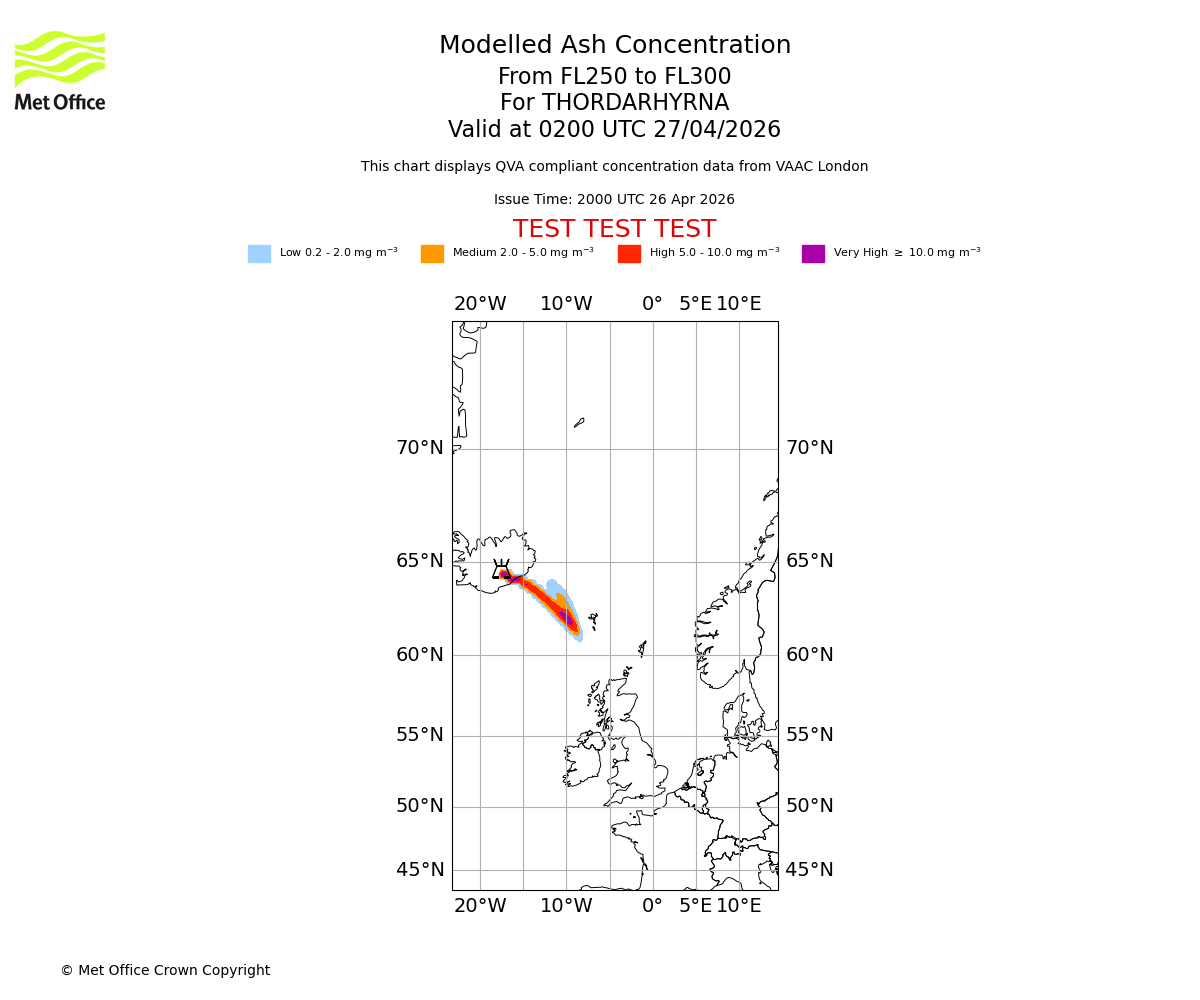 Modelled ash concentration from 250 to 300 for THORDARHYRNA. Valid at 2300 UTC 26/04/2026