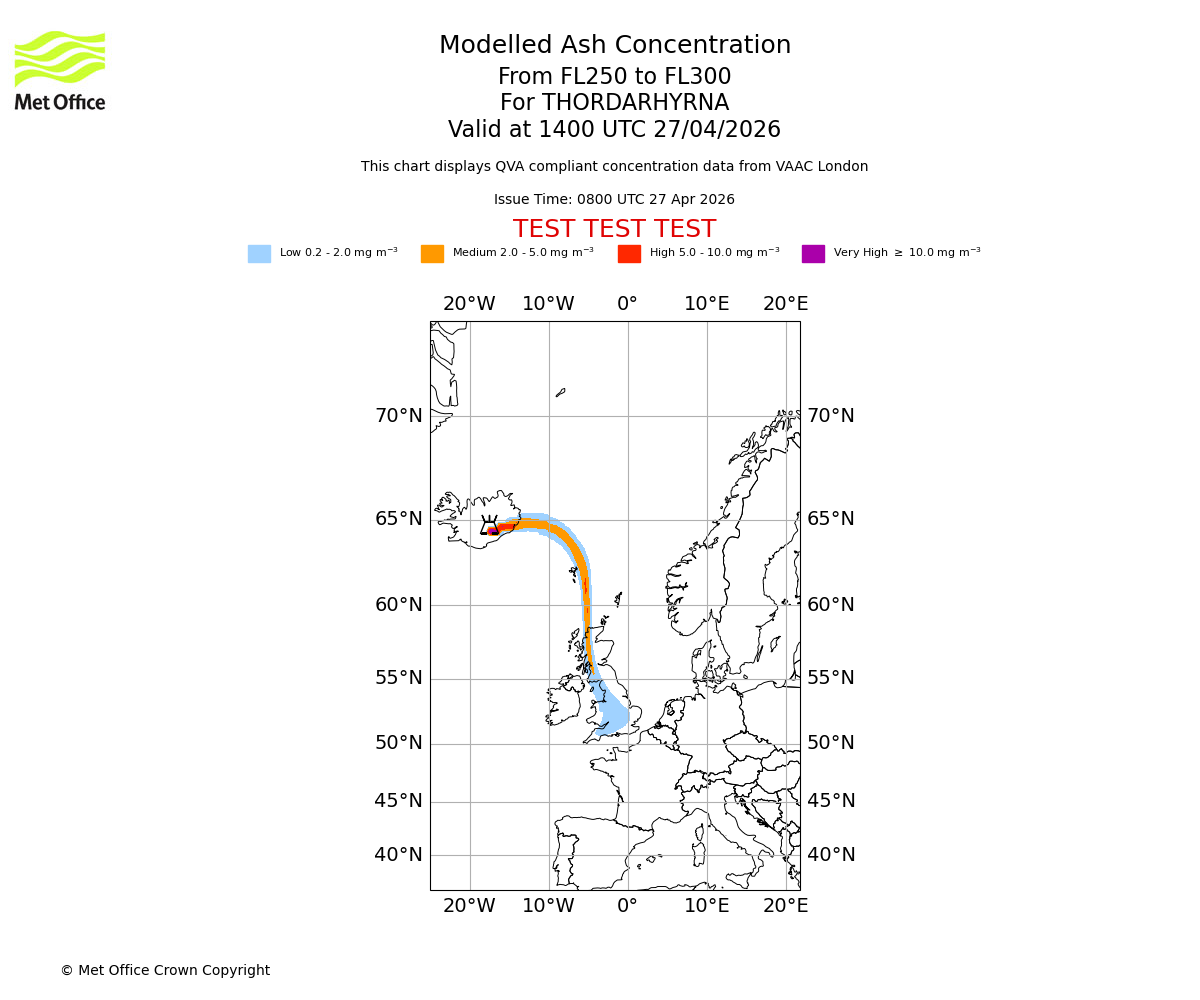 Modelled ash concentration from 250 to 300 for THORDARHYRNA. Valid at 1100 UTC 27/04/2026