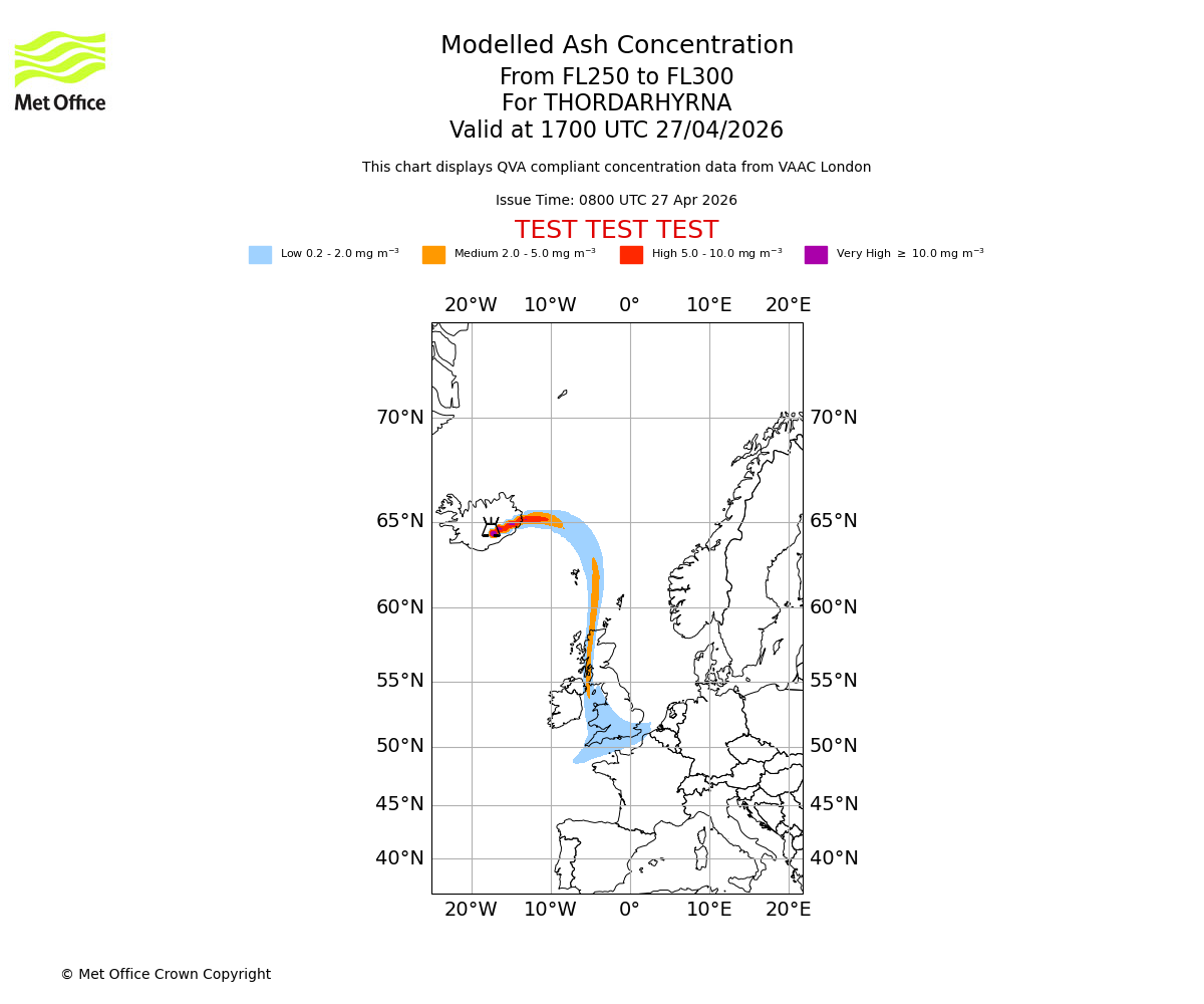 Modelled ash concentration from 250 to 300 for THORDARHYRNA. Valid at 1400 UTC 27/04/2026