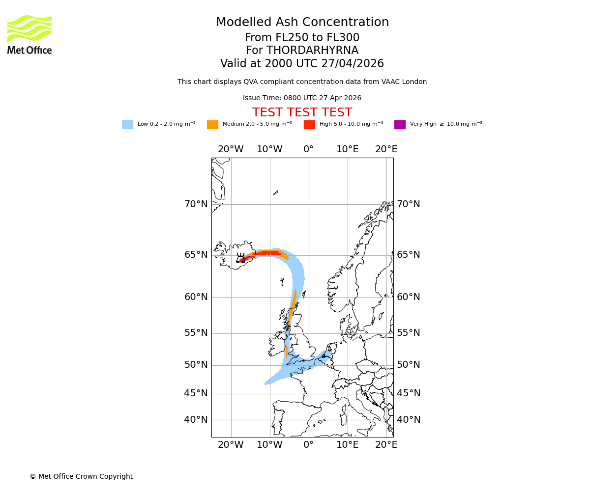 Modelled ash concentration from 250 to 300 for THORDARHYRNA. Valid at 1700 UTC 27/04/2026