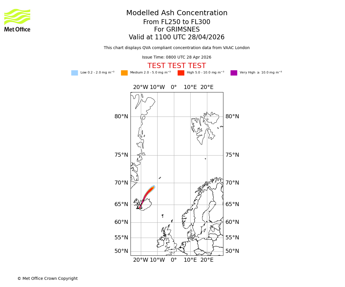 Modelled ash concentration from 250 to 300 for GRIMSNES. Valid at 0800 UTC 28/04/2026