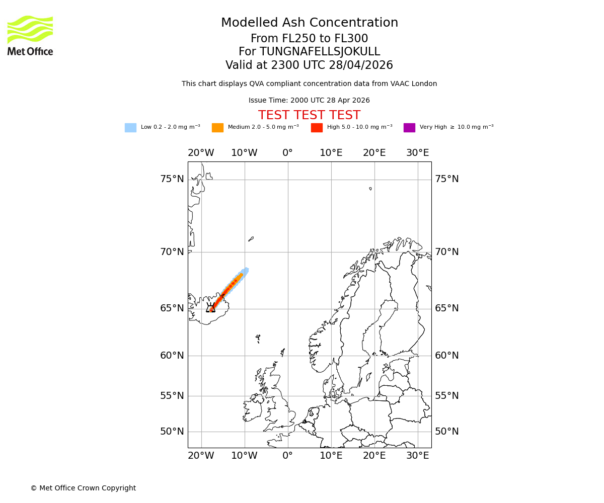 Modelled ash concentration from 250 to 300 for TUNGNAFELLSJOKULL. Valid at 2000 UTC 28/04/2026