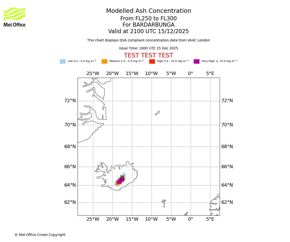 Modelled ash concentration from 250 to 300 for BARDARBUNGA. Valid at 1800 UTC 15/12/2025