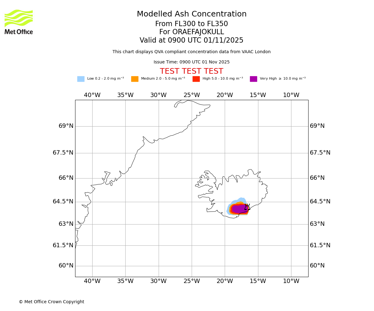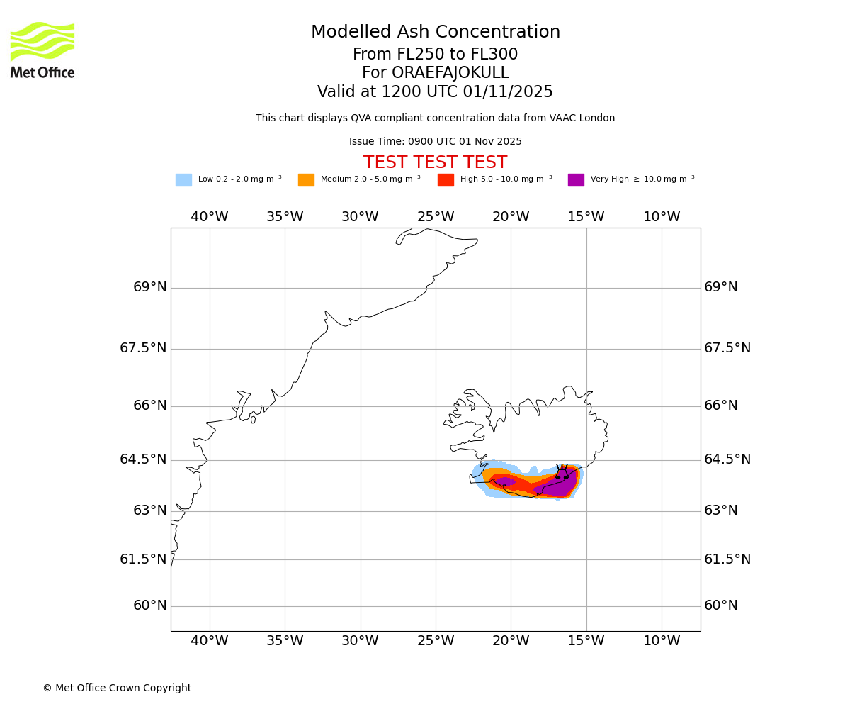 Modelled ash concentration from 250 to 300 for ORAEFAJOKULL. Valid at 0900 UTC 01/11/2025