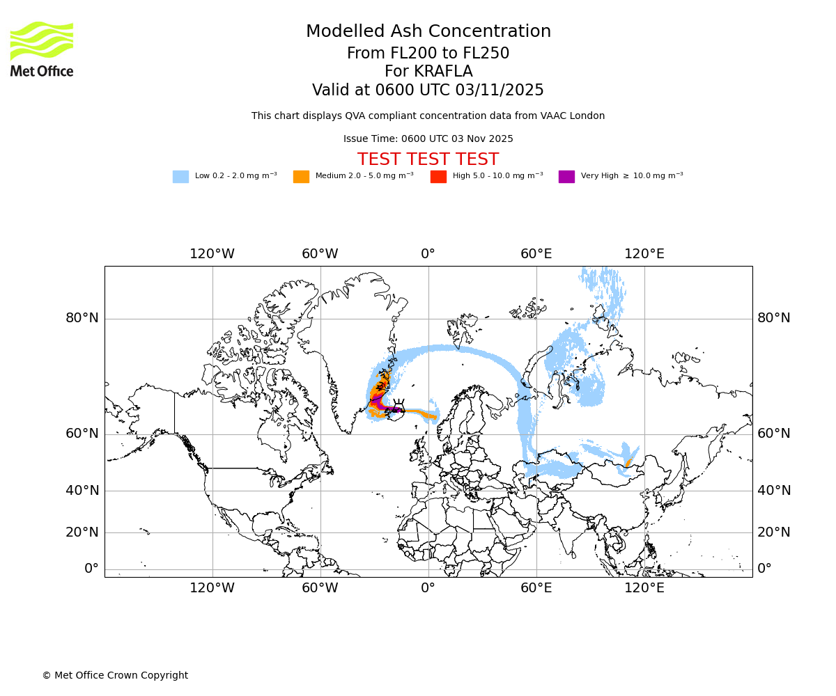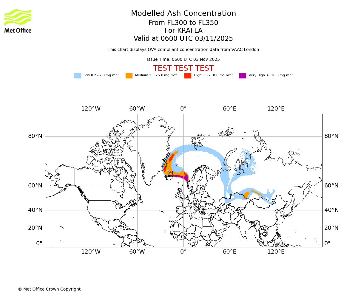 In accordance with ICAO Annex 3, Amendment 82 VAAC London will provide operational QVA forecasts from 27 November 2025 and these will be made available via a VAAC London QVA API information service. These charts are currently provided for test and evaluation purposes (not for operational use) until the introduction of the operational service.