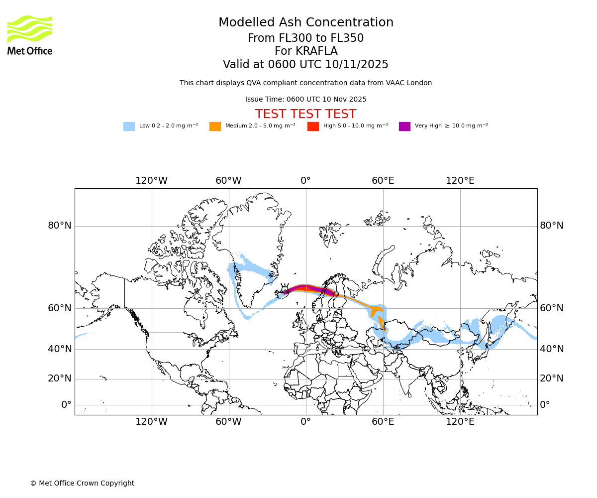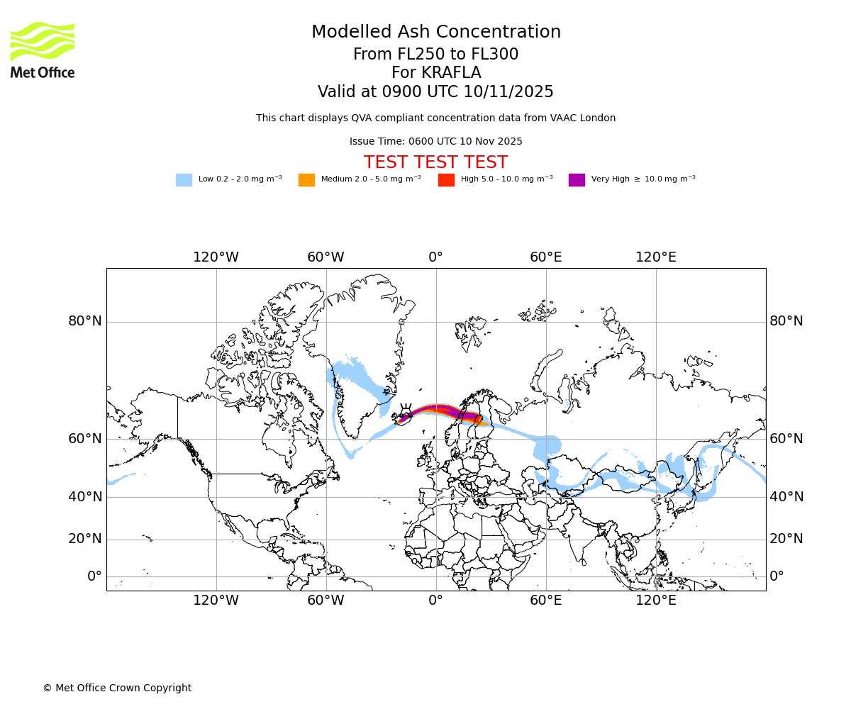 In accordance with ICAO Annex 3, Amendment 82 VAAC London will provide operational QVA forecasts from 27 November 2025 and these will be made available via a VAAC London QVA API information service. These charts are currently provided for test and evaluation purposes (not for operational use) until the introduction of the operational service.
