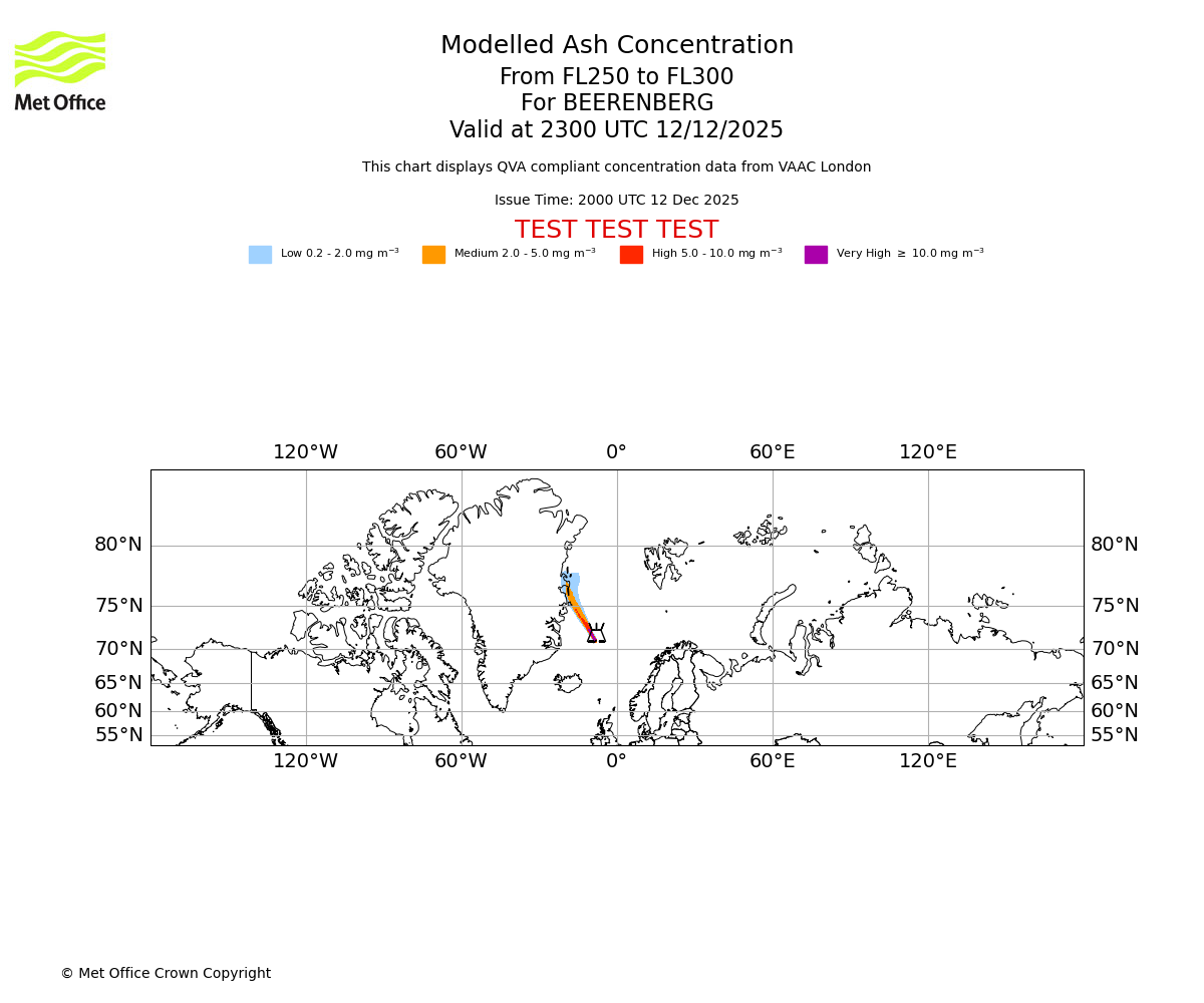 Modelled ash concentration from 250 to 300 for BEERENBERG. Valid at 2000 UTC 12/12/2025