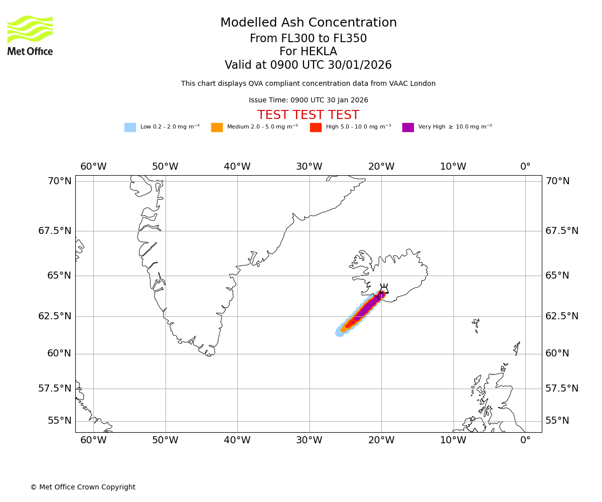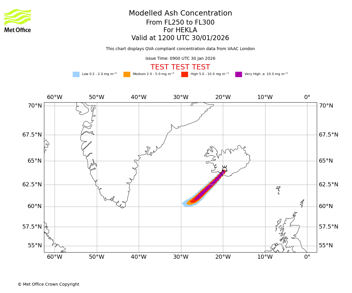 Modelled ash concentration from 250 to 300 for HEKLA. Valid at 0900 UTC 30/01/2026