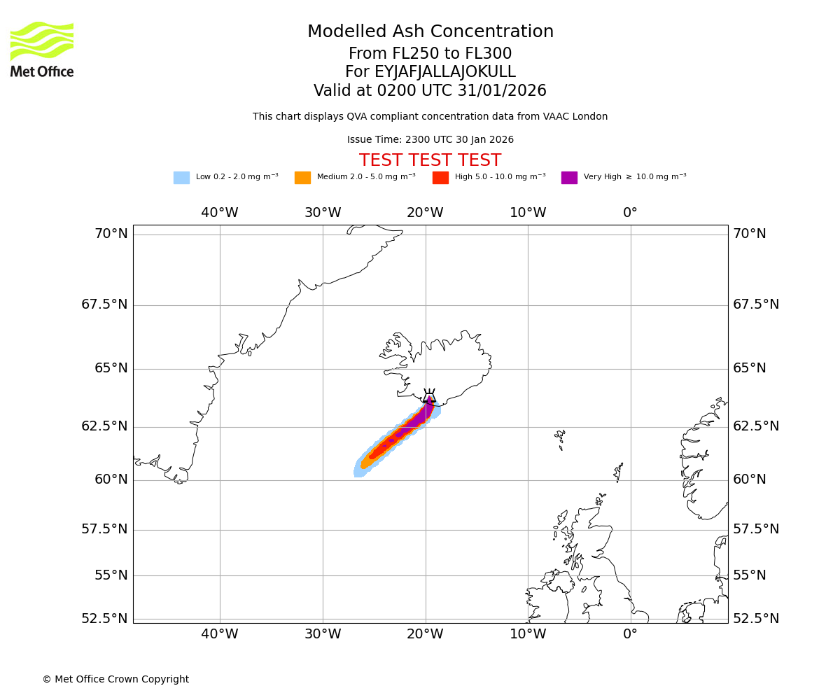 Modelled ash concentration from 250 to 300 for EYJAFJALLAJOKULL. Valid at 2300 UTC 30/01/2026