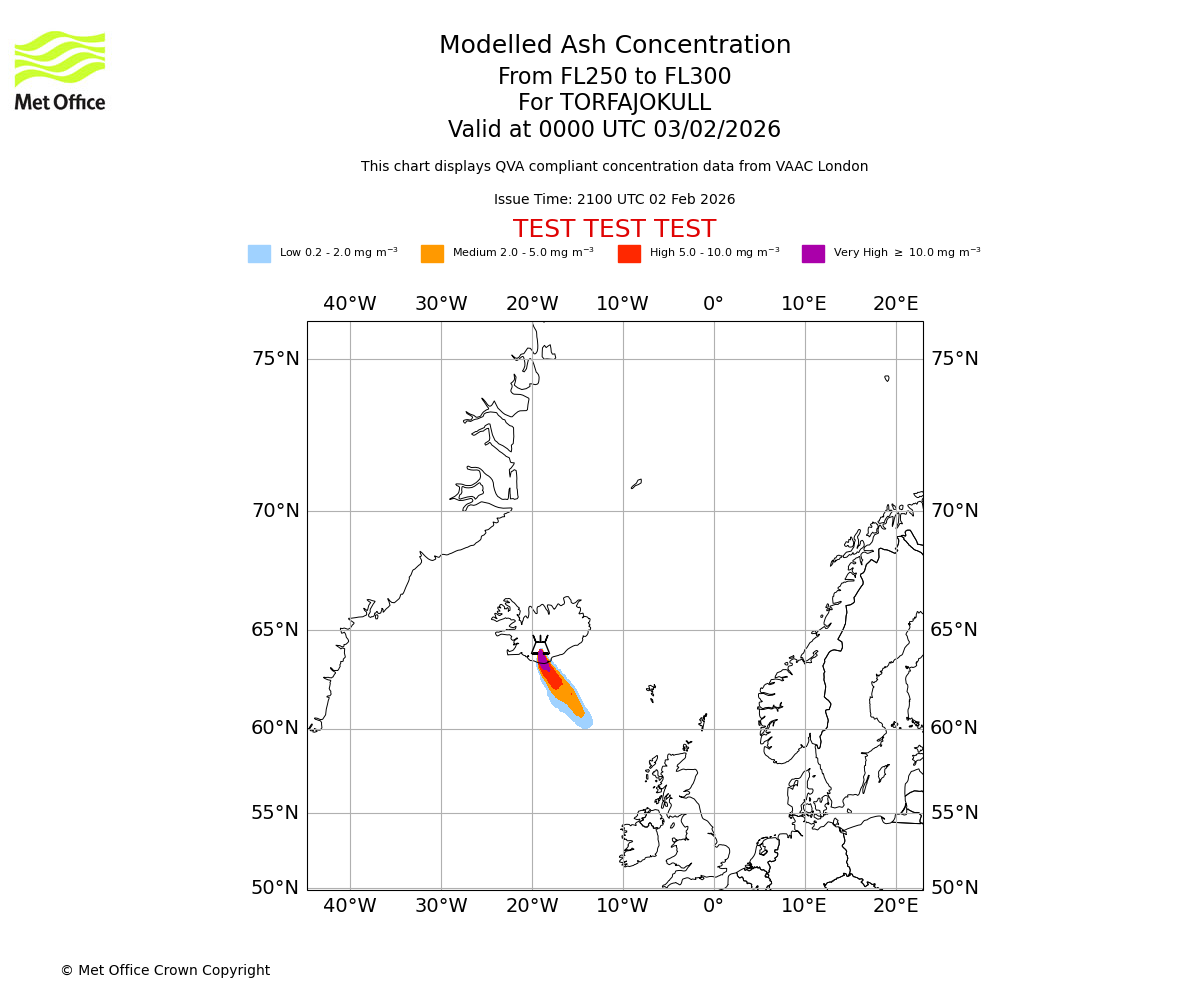 Modelled ash concentration from 250 to 300 for TORFAJOKULL. Valid at 2100 UTC 02/02/2026