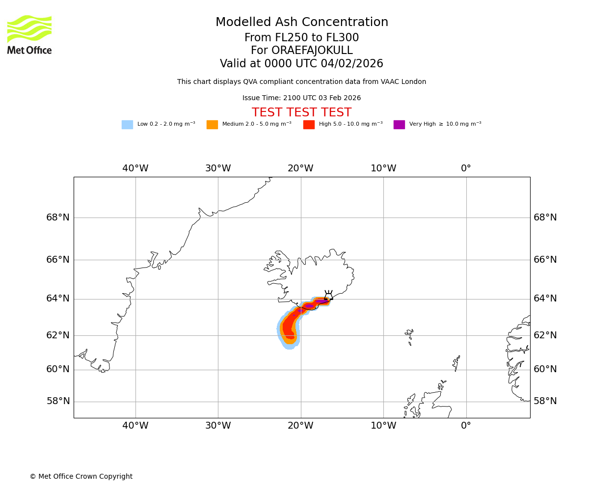 Modelled ash concentration from 250 to 300 for ORAEFAJOKULL. Valid at 2100 UTC 03/02/2026