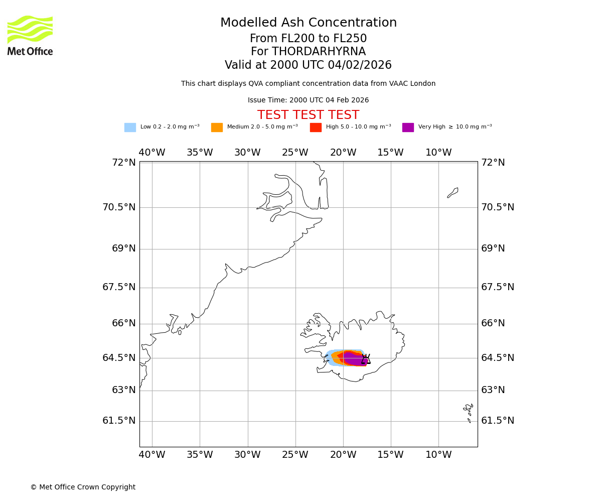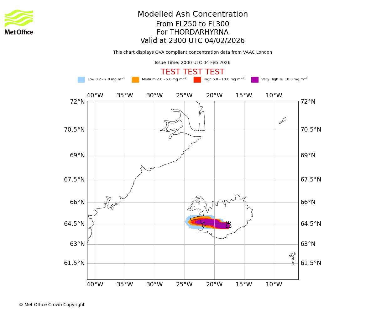 Modelled ash concentration from 250 to 300 for THORDARHYRNA. Valid at 2000 UTC 04/02/2026