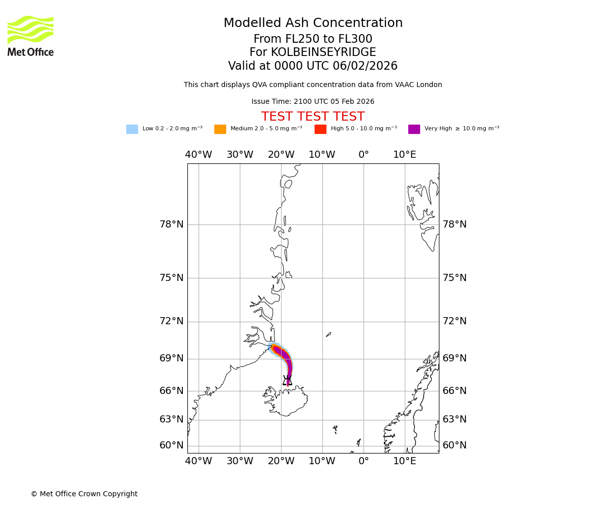 Modelled ash concentration from 250 to 300 for KOLBEINSEYRIDGE. Valid at 2100 UTC 05/02/2026