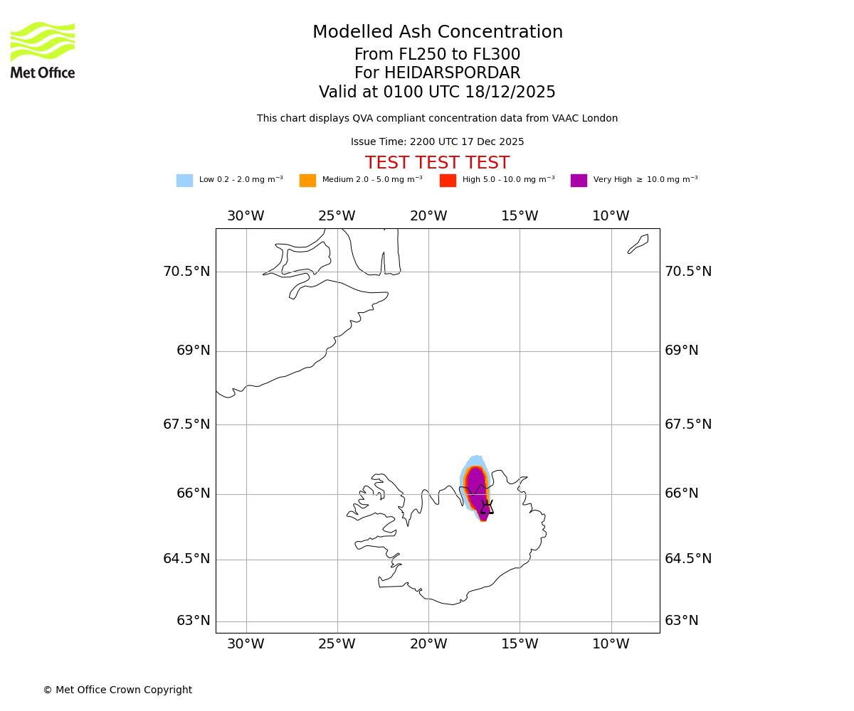 Modelled ash concentration from 250 to 300 for HEIDARSPORDAR. Valid at 2200 UTC 17/12/2025