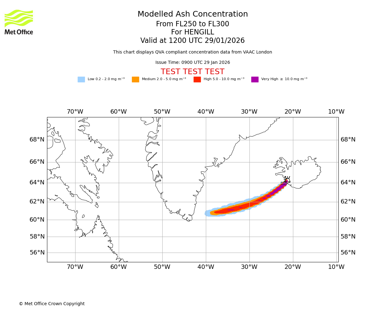Modelled ash concentration from 250 to 300 for HENGILL. Valid at 0900 UTC 29/01/2026