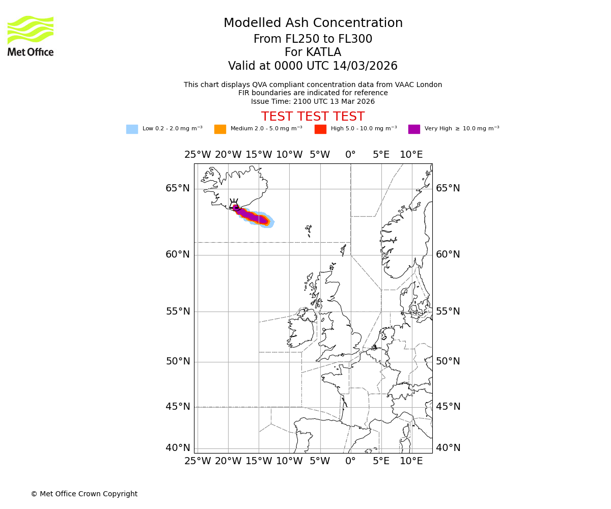 Modelled ash concentration from 250 to 300 for KATLA. Valid at 2100 UTC 13/03/2026