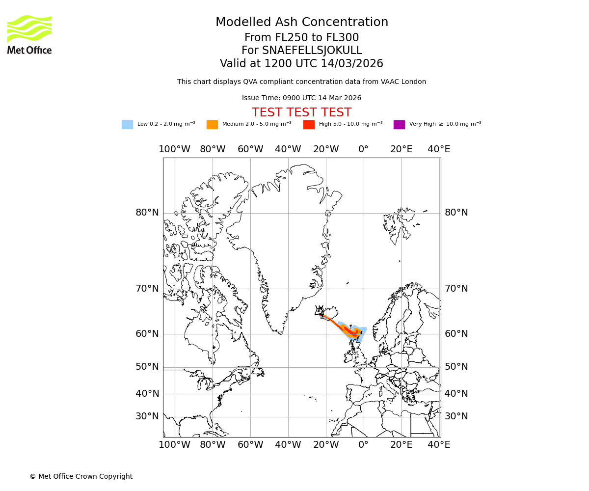 Modelled ash concentration from 250 to 300 for SNAEFELLSJOKULL. Valid at 0900 UTC 14/03/2026