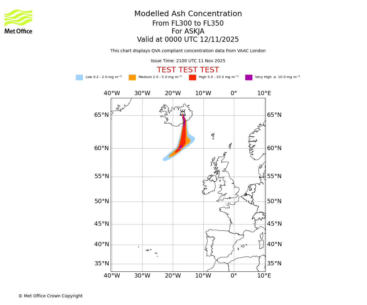In accordance with ICAO Annex 3, Amendment 82 VAAC London will provide operational QVA forecasts from 27 November 2025 and these will be made available via a VAAC London QVA API information service. These charts are currently provided for test and evaluation purposes (not for operational use) until the introduction of the operational service.