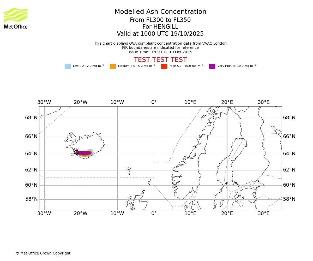 Modelled ash concentration from 300 to 350 for HENGILL. Valid at 0700 UTC 19/10/2025
