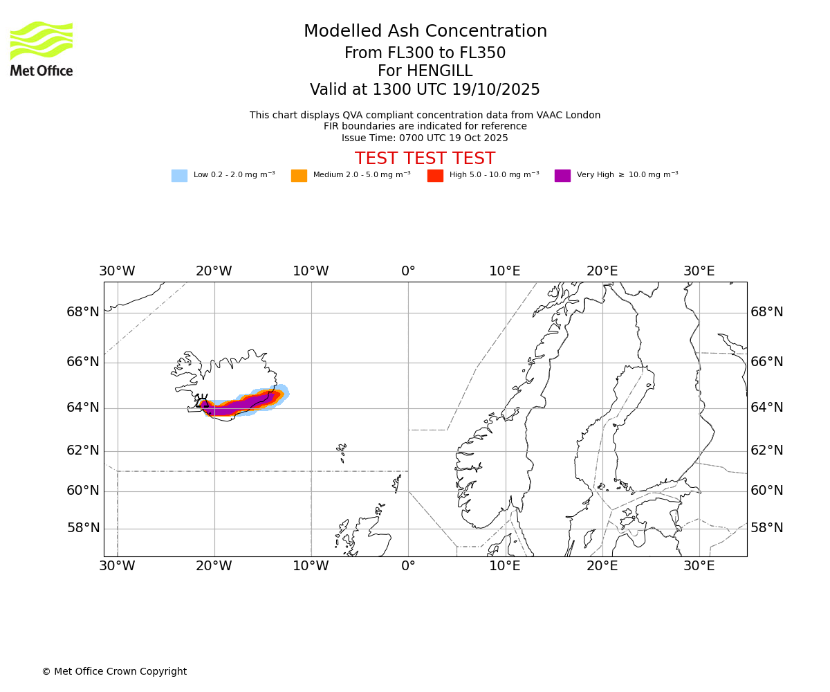 Modelled ash concentration from 300 to 350 for HENGILL. Valid at 1000 UTC 19/10/2025