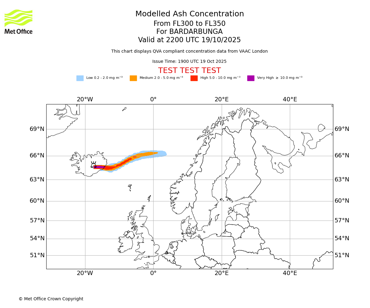 Modelled ash concentration from 300 to 350 for BARDARBUNGA. Valid at 1900 UTC 19/10/2025