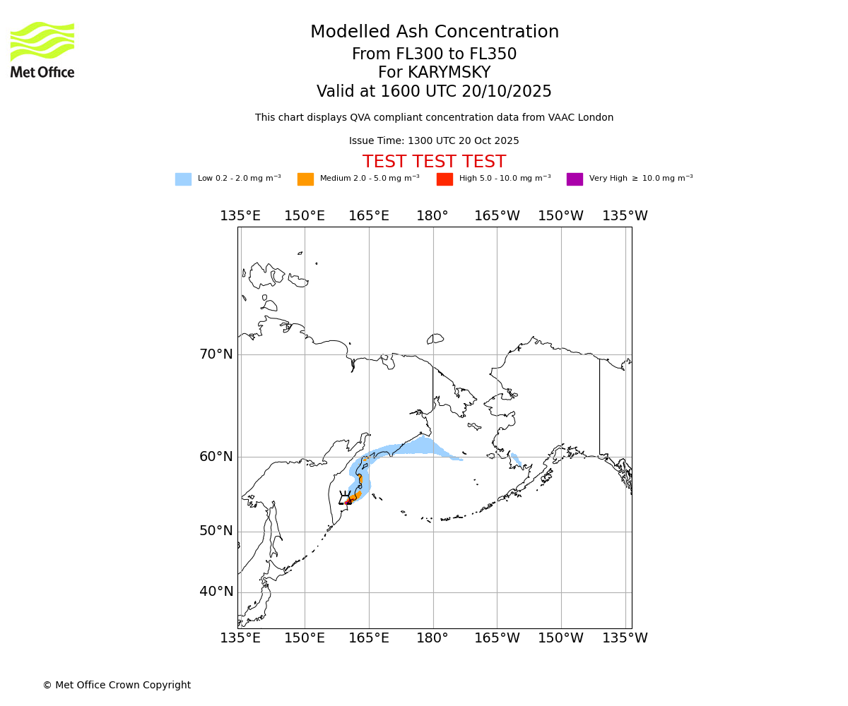 Modelled ash concentration from 300 to 350 for KARYMSKY. Valid at 1300 UTC 20/10/2025