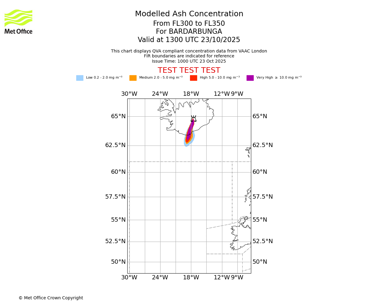 Modelled ash concentration from 300 to 350 for BARDARBUNGA. Valid at 1000 UTC 23/10/2025