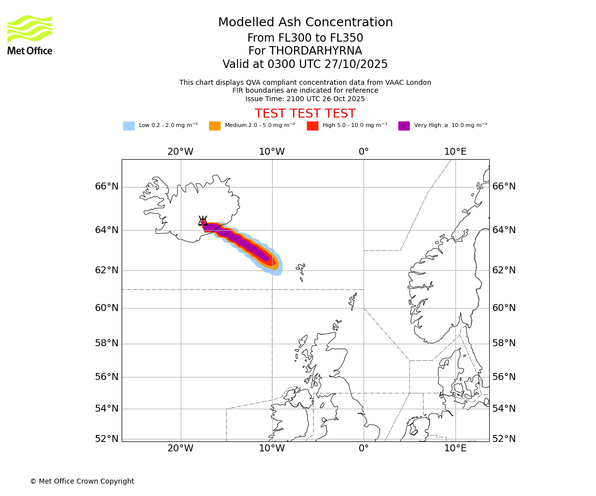 Modelled ash concentration from 300 to 350 for THORDARHYRNA. Valid at 0000 UTC 27/10/2025