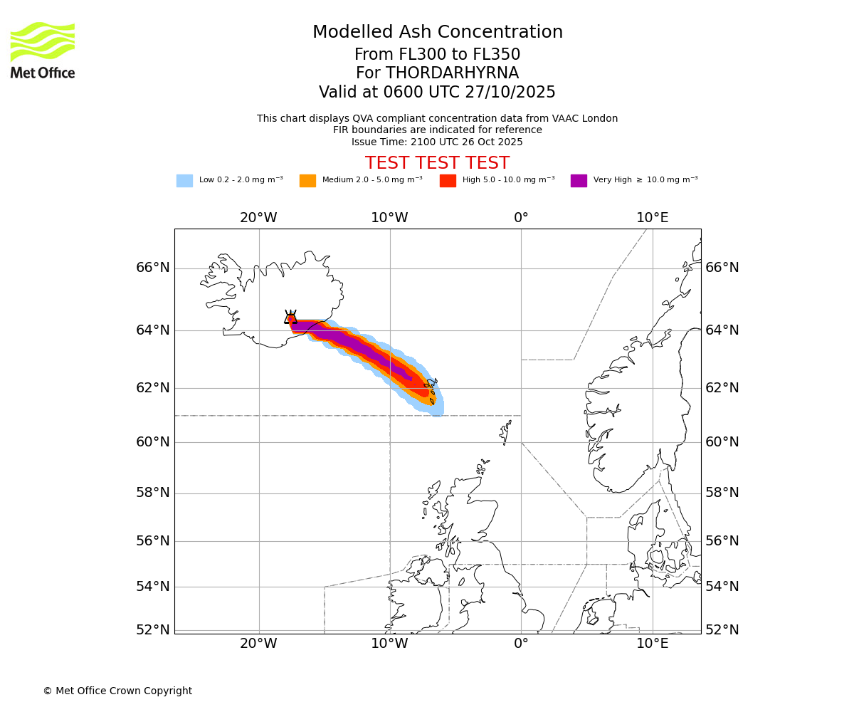 Modelled ash concentration from 300 to 350 for THORDARHYRNA. Valid at 0300 UTC 27/10/2025
