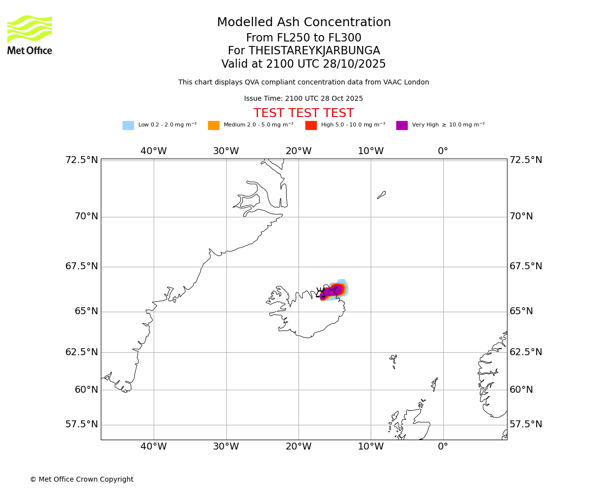 Modelled ash concentration from 300 to 350 for THEISTAREYKJARBUNGA. Valid at 2100 UTC 28/10/2025